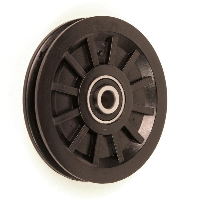 Kabelschijven zwart POM (Polyoxymethyleen). 1-kogellager (KBS052G06 is met glijlager). Met V-groef afgerond onderin.