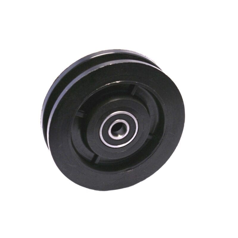Groefwiel van zwart polyamide (PA). Vierkante groef. 2-precisiekogellagers (GW-VPK0600708 is met 1-kogellager).
