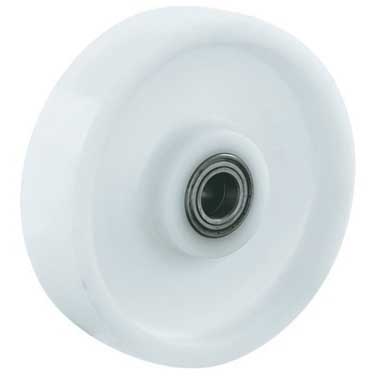 Wiel serie 9P. Polyamide (PA) wit. Kogellager. Ook leverbaar in glijlager of rollager. Bedoeld voor gladde ondergrond welke niet kwetsbaar is.
