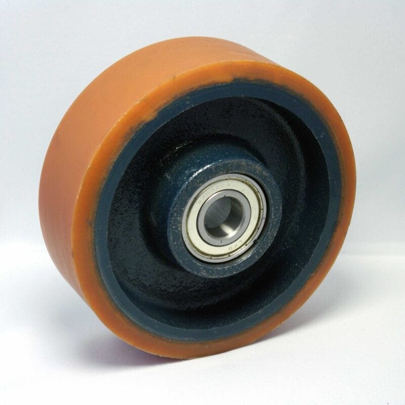 Wiel serie 2D. Polyurethaan (PU) band (95 graden +/- 3 graden Shore A). Gietijzern kern. Kogellager.