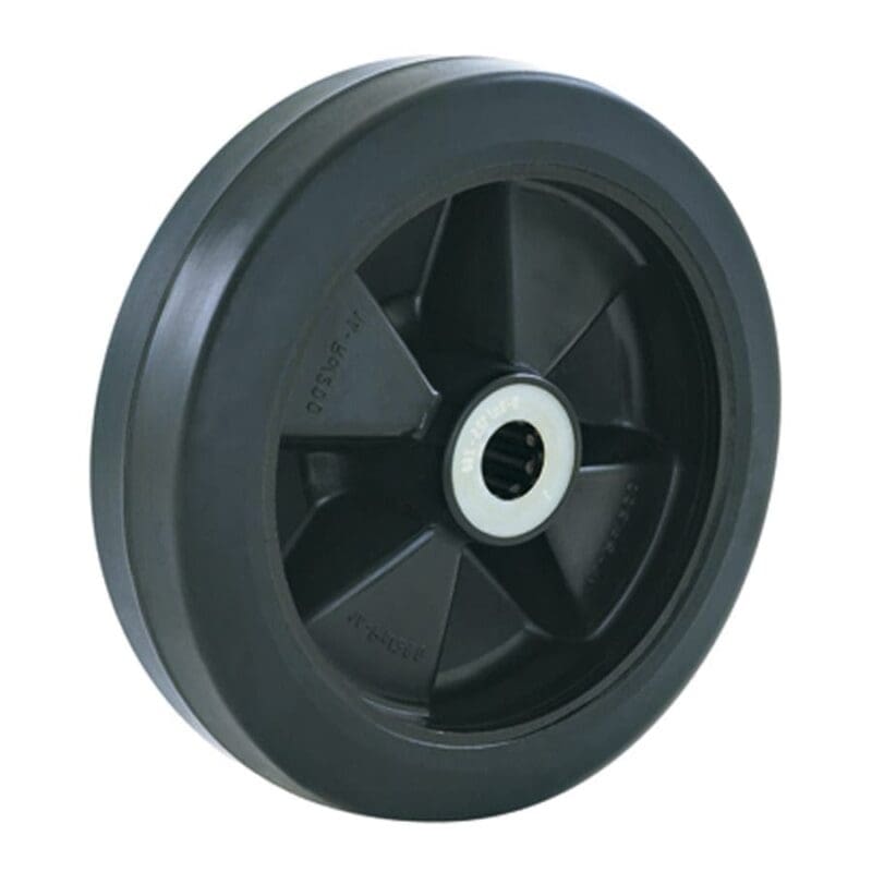 Wiel serie 3O. Elastische opgevulcaniseerde zwart rubberband (67 graden shore A) Polyamide velg. Rollager of kogellager. Zwart rubber kan strepen / afgeven.