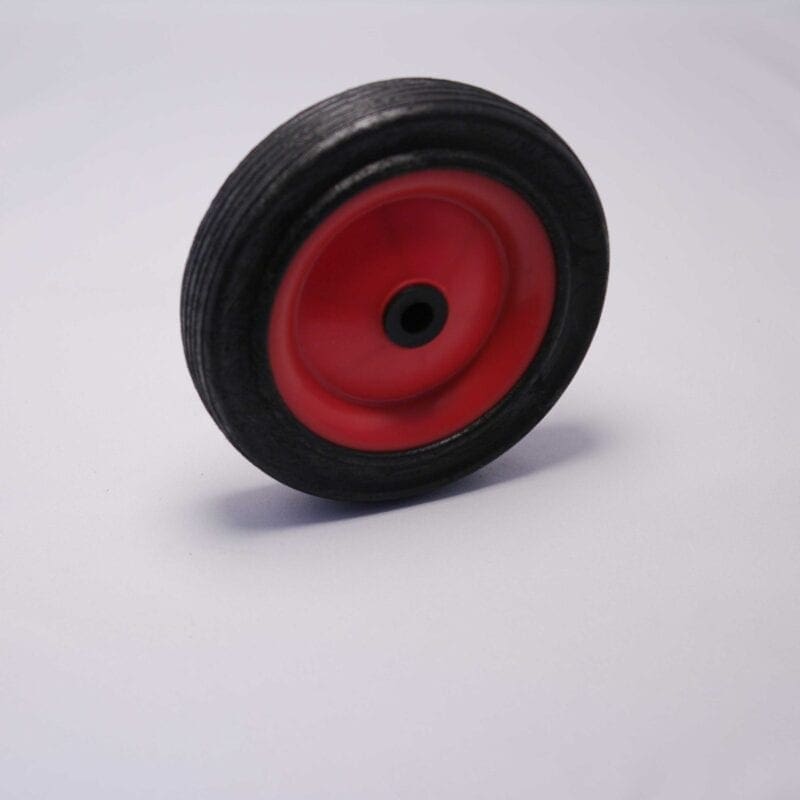 Wiel serie 4K. Polyschuimband met rode polypropyleen velg. Glijlager. Asgat 6 of 10 mm. doorsnede optioneel. Vul dan in G06 of G10 i.p.v. G08. De wielen kunnen op een gladde as geborgd worden met een snelborger.