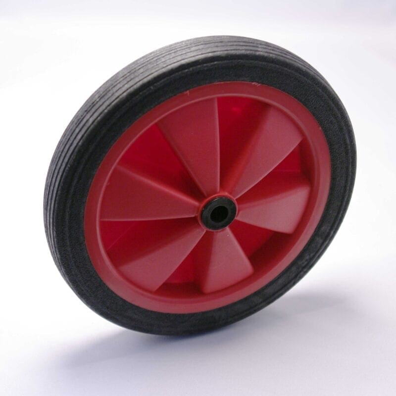 Wiel serie 4K. Polyschuimband met rode polypropyleen velg. Glijlager. Asgat 6 of 10 mm. doorsnede optioneel. Vul dan in G06 of G10 i.p.v. G08. De wielen kunnen op een gladde as geborgd worden met een snelborger.