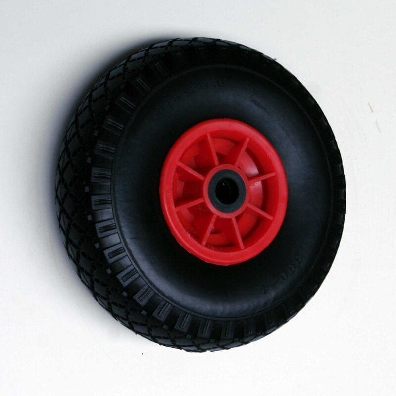 Polyurethaan (PU) wielen met een rode kunststof velg.