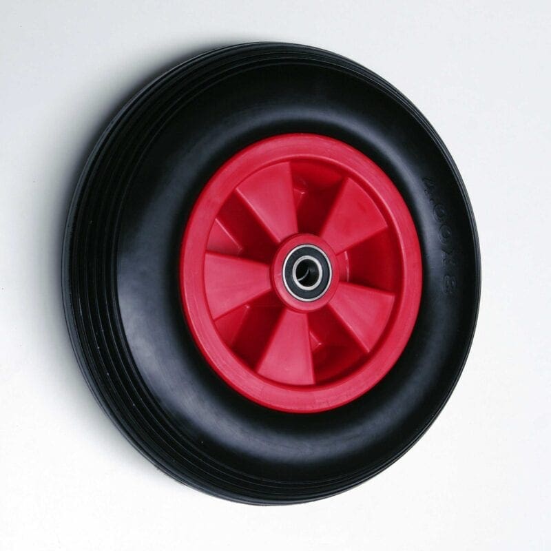 Polyurethaan (PU) wielen met een rode kunststof velg.
