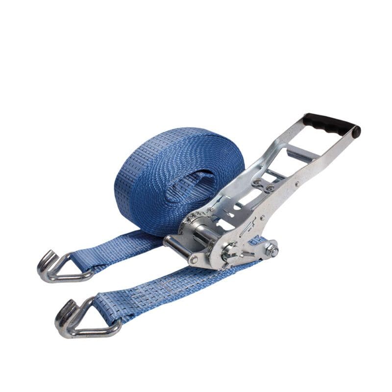 Spanband 2-delig van 100% polyester (PES) met ergonomische ratel bedoeld voor het snel en veilig vastzetten of sjoren van ladingen. Geproduceerd volgens NEN-EN 12195-2. Labels met aanduiding van veilige werklast. Niet bedoeld om mee te hijsen.