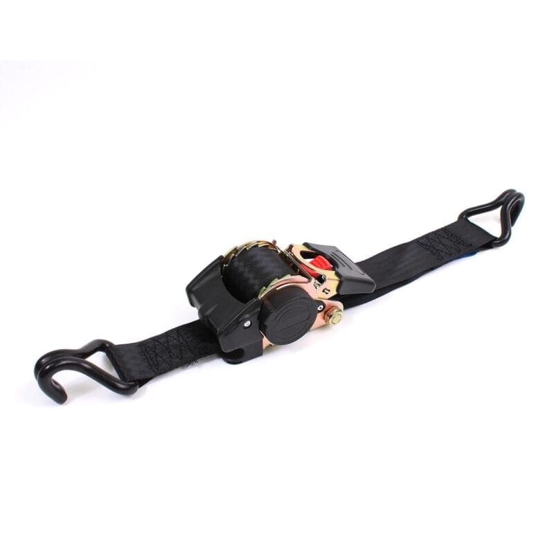 Het voordeel van deze spanband is nooit meer los rondslingerende banden welke in de knoop zitten wanneer je ze nodig hebt. Met 1 druk op de knop rolt de band zich weer netjes op.