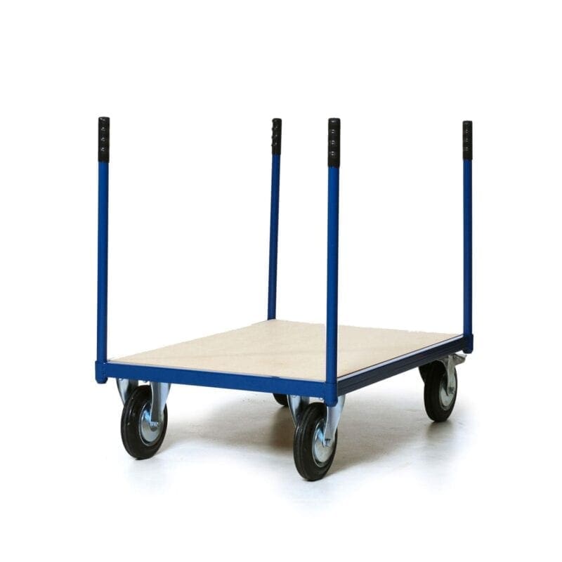Rongenwagen. Laadvlak voorzien van MDF. V.v. 2 bokwielen en 2 zwenkwielen met rem 200 mm. doorsnede. Wiel massief zwart rubber. Rongen lengte 645 mm.