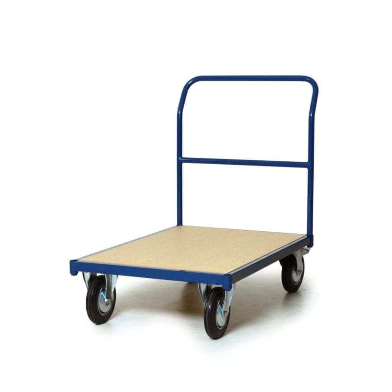 Magazijnwagen van staalbuis met duwbeugel. Laadvlak voorzien van MDF. V.v. 2 bokwielen en 2 zwenkwielen met rem 200 mm. doorsnede. Wiel massief zwart rubber.