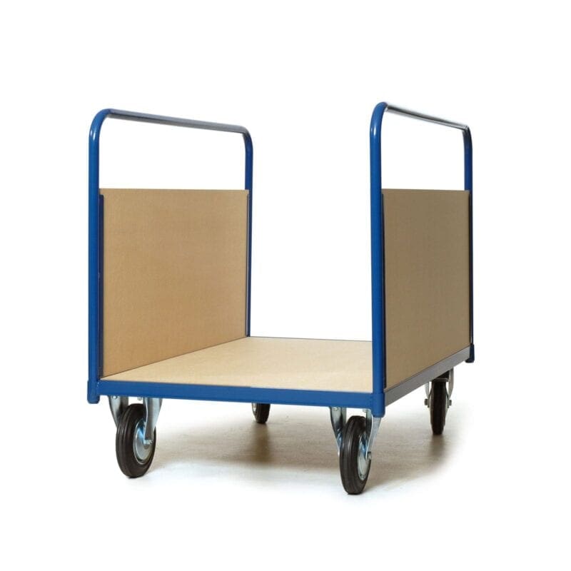 Langmateriaalwagen van staalbuis met 2 wanden van MDF. Laadvlak voorzien van MDF. V.v. 2 bokwielen en 2 zwenkwielen met rem 200 mm. doorsnede. Wiel massief zwart rubber.