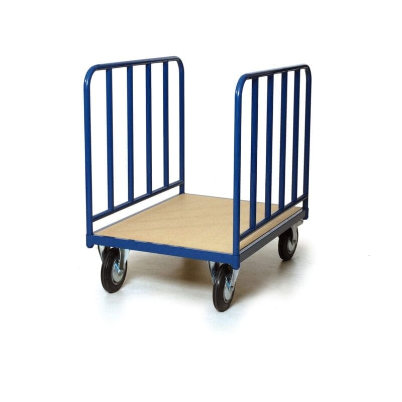 Langmateriaalwagen met 2 wanden van staalbuis. Laadvlak voorzien van MDF. V.v. 2 bokwielen en 2 zwenkwielen met rem 200 mm. doorsnede. Wiel massief zwart rubber.