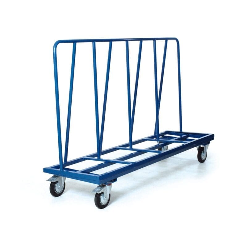 Platenwagen van staalbuis. Afmetingen 2250 x 700 mm. V.v. 2 bokwielen en 2 zwenkwielen met rem 200 mm. doorsnede. Wiel massief zwart rubber.