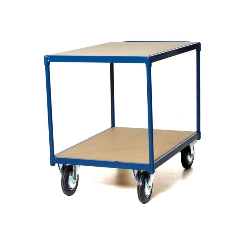 Tafelwagen van staalbuis. 2-Laadvlakken voorzien van MDF. V.v. 2 bokwielen en 2 zwenkwielen met rem 200 mm. doorsnede. Wiel massief zwart rubber.