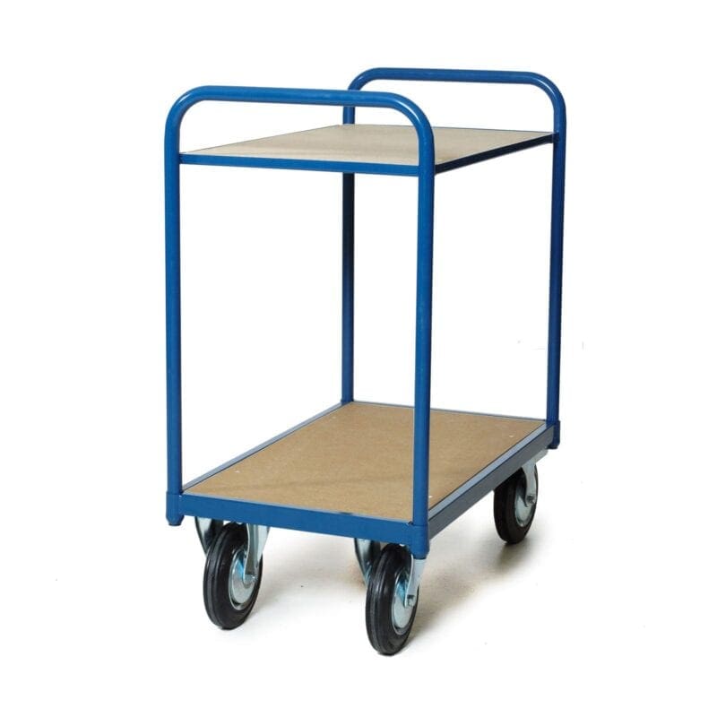 Tafelwagen van staalbuis. 2-Laadvlakken voorzien van MDF. V.v. 2 bokwielen en 2 zwenkwielen met rem 200 mm. doorsnede. Wiel massief zwart rubber.