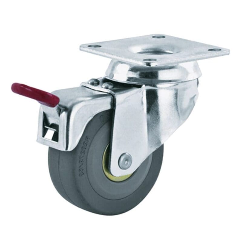 Plaatstalen vork, verzinkt-gepassiveerd. Zwenkkrans dubbel gelagerd. Wiel serie 3R. Grijs rubberband (80 graden Shore A) kunststof velg. Conuskogellager. Rem blokkeert alleen wiel. Geeft niet af / streept niet.