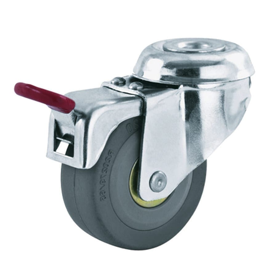 Plaatstalen vork, verzinkt-gepassiveerd. Zwenkkrans dubbel gelagerd. Wiel serie 3R. Grijs rubberband (80 graden Shore A) kunststof velg. Conuskogellager. Rem blokkeert alleen wiel. Geeft niet af / streept niet.