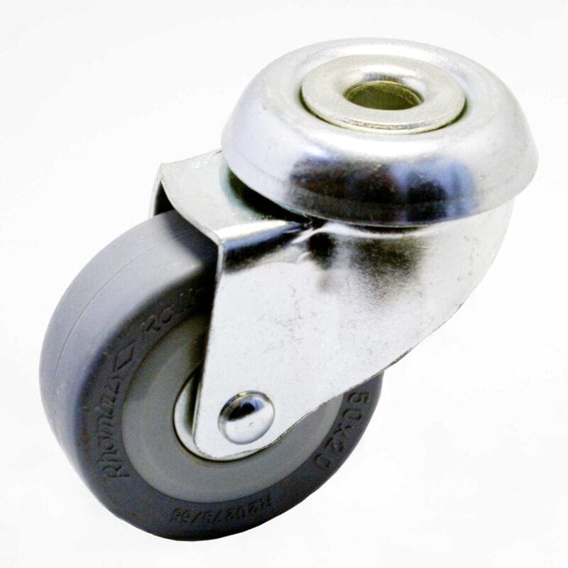 Plaatstalen vork, verzinkt-gepassiveerd. Zwenkkrans dubbel gelagerd. Wiel serie 3R. Grijs rubberband (80 graden Shore A) kunststof velg. Conuskogellager. Geeft niet af / streept niet.