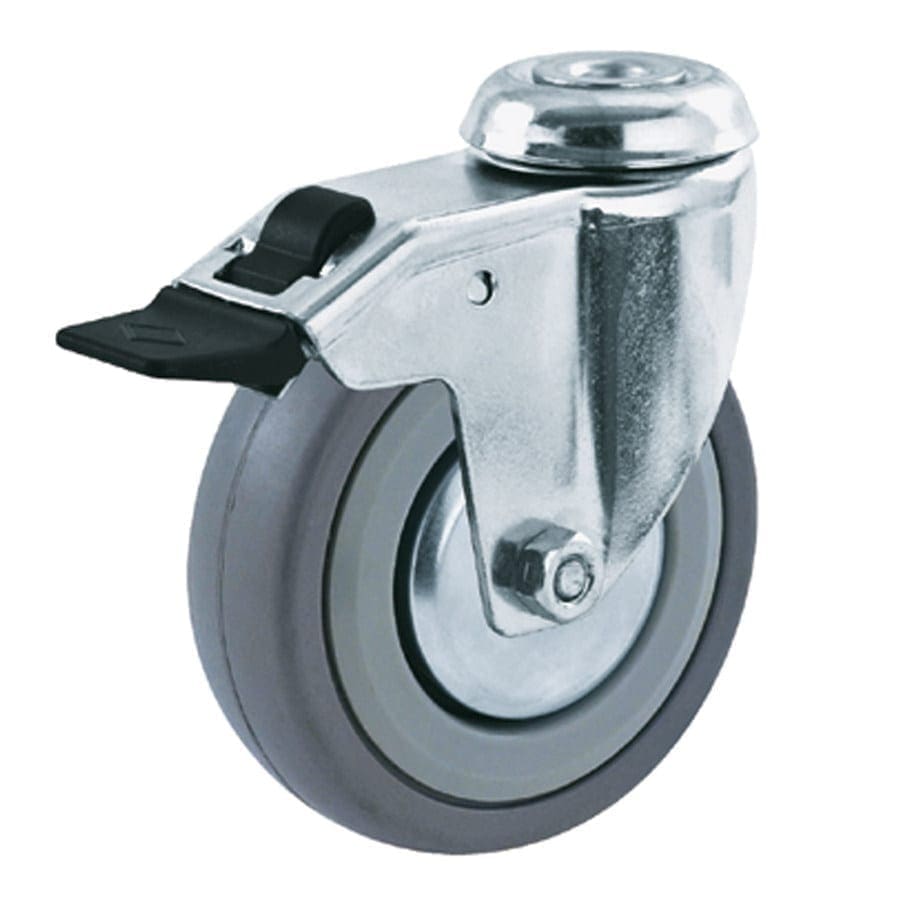 Plaatstalen vork, verzinkt-gepassiveerd. Zwenkkrans dubbel gelagerd. Wiel serie 3R, grijs rubberband (80 graden Shore A)met kunststof velg, conuskogellager. Wiel serie 5R, grijs rubberband (80 graden Shore A) met plaatstalen velg, conuskogellager. Plaatstalen verzinkt en gepassiveerde draadbeschermingskap. Rem blokkeert wiel en zwenk. Geeft niet af / streept niet.