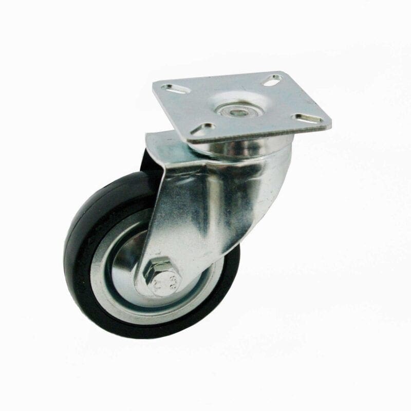 Plaatstalen vork, verzinkt-gepassiveerd. Zwenkkrans dubbel gelagerd. Wiel serie 5A. Anti-statisch / elektrisch geleidend zwart rubberband (80 graden Shore A) met plaatstalen velg, conuskogellager. Conuskogellager. Geeft niet af / streept niet.
