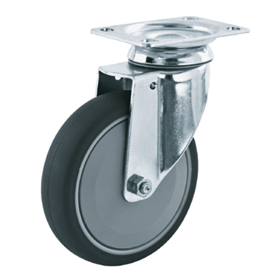 Plaatstalen vork, verzinkt-gepassiveerd. Zwenkkrans dubbel gelagerd. Stof- en spatwater afdichting in zwenkkrans d.m.v. een kunststof ring. Wiel serie 4C. thermoplastische grijs rubberband (RAL7011). Kunststof velg met kunststof draad beschermingskappen (RAL 7001). 1-Precisiekogellager. Geeft niet af / streept niet.