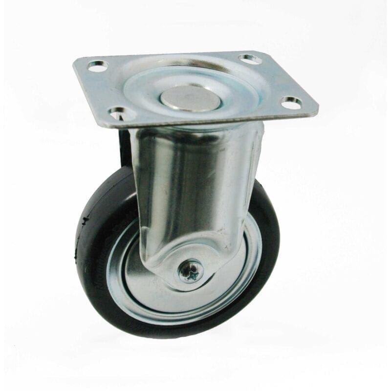 Plaatstalen vork, verzinkt-gepassiveerd. Zwenkkrans dubbel gelagerd. Wiel serie 5A. Anti-statisch / elektrisch geleidend zwart rubberband (80 graden Shore A) met plaatstalen velg, conuskogellager. Conuskogellager. Geeft niet af / streept niet.