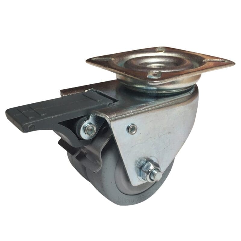 Plaatstalen vork, verzinkt-gepassiveerd. Zwenkkrans dubbel gelagerd. Wiel serie 3R. grijs rubberband (80 graden Shore A) met kunststof velg. Conuskogellager. Rem blokkeert wiel en zwenk. Geeft niet af / streept niet.