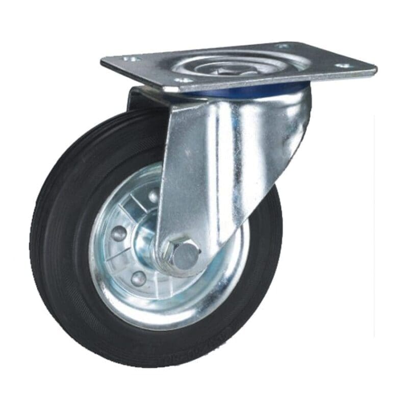 Plaatstalen vork, verzinkt-gepassiveerd. Zwenkkrans dubbel gelagerd. Wiel serie 5Z. Zwart rubberband (shore A 80). Plaatstalen velg verzinkt-gepassiveerd. Rollager. Zwart rubber kan strepen / afgeven