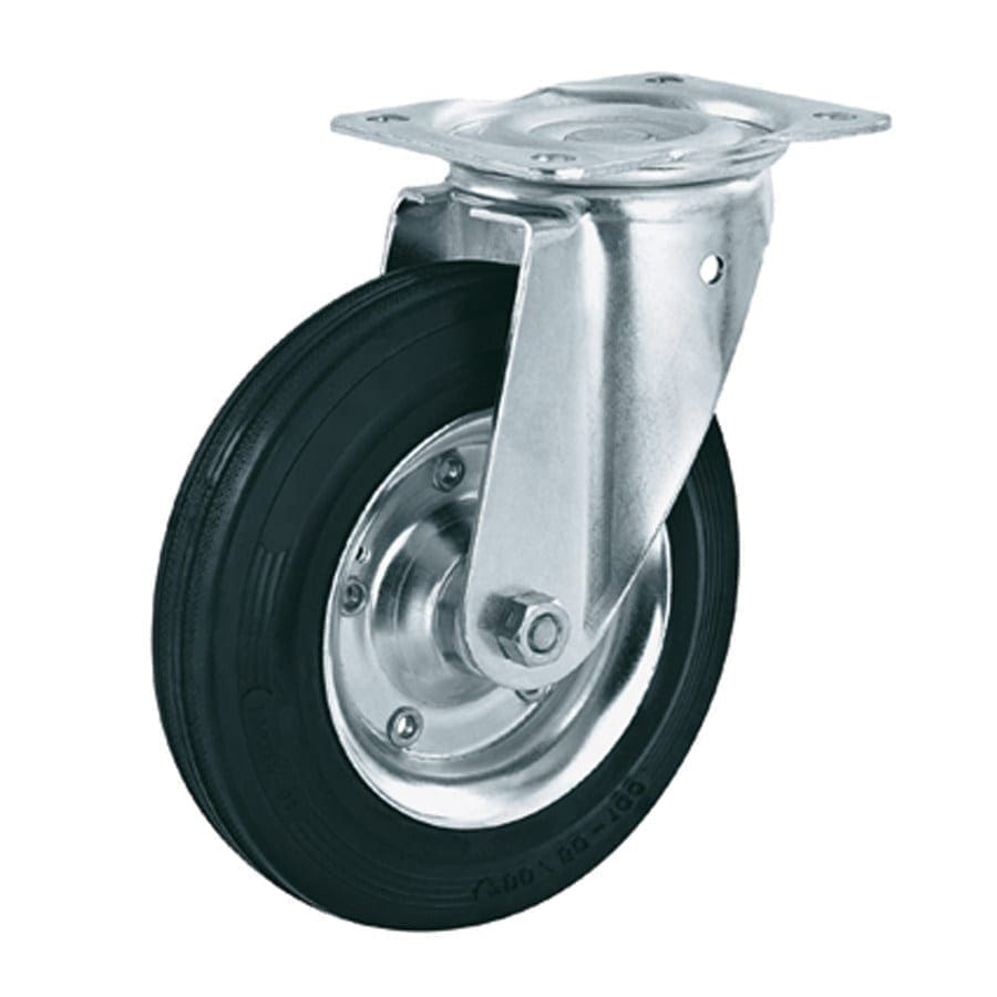 Plaatstalen vork, verzinkt-gepassiveerd. Zwenkkrans dubbel gelagerd. Wiel serie 5Z. Zwart rubberband (shore A 80). Plaatstalen velg verzinkt-gepassiveerd. Rollager. Zwart rubber kan strepen / afgeven