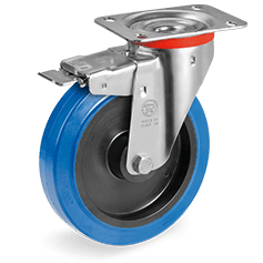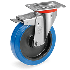 Plaatstalen vork, verzinkt-gepassiveerd. Zwenkkrans dubbel gelagerd. Wiel serie 3B. Zwarte kunststof kern met opgevulkaniseerd blauwe rubberband (70 graden Shore A). Rollager. Geeft niet af / streept niet.
