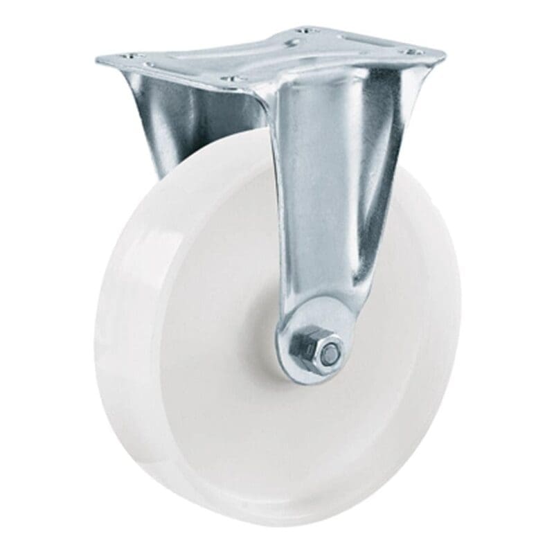 Plaatstalen vork, verzinkt-gepassiveerd. Zwenkkrans dubbel gelagerd. Wiel serie 3P. Polyamide (PA) wit. Rollager. Bedoeld voor gladde ondergrond welke niet kwetsbaar is.