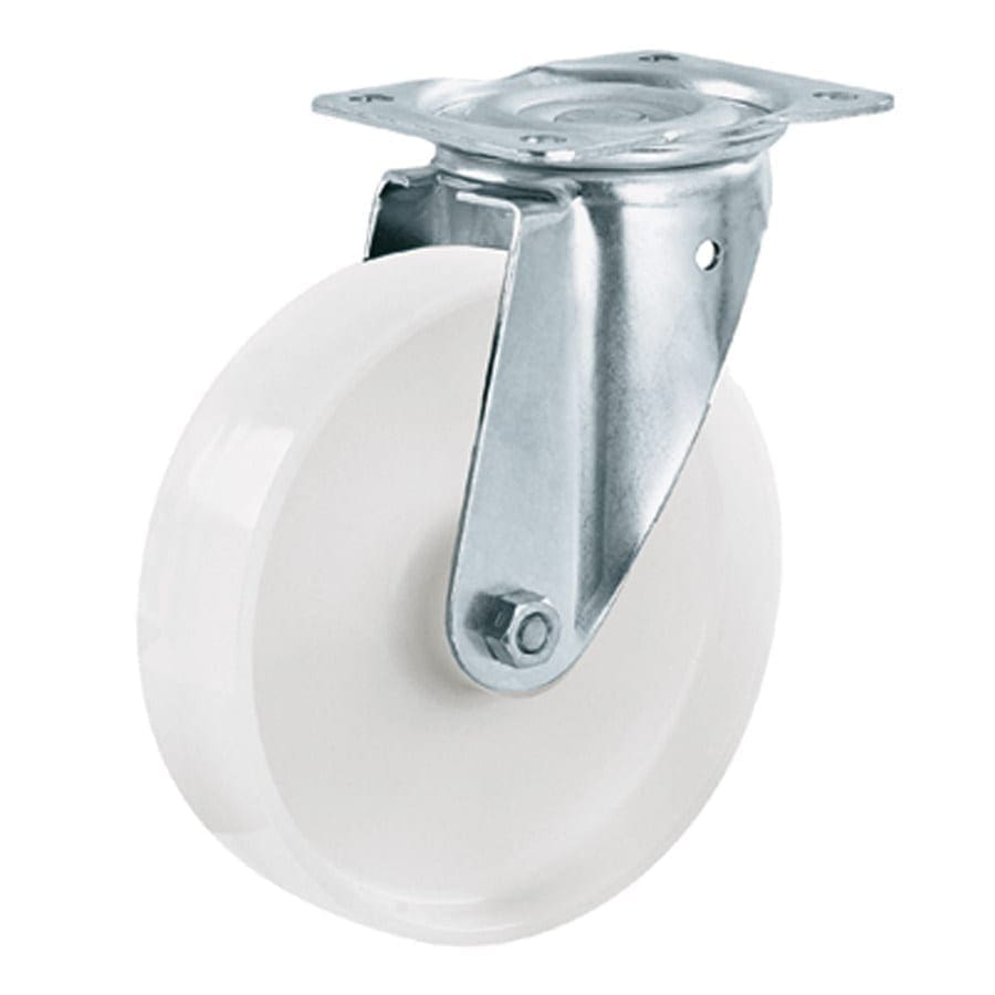 Plaatstalen vork, verzinkt-gepassiveerd. Zwenkkrans dubbel gelagerd. Wiel serie 3P. Polyamide (PA) wit. Rollager. Bedoeld voor gladde ondergrond welke niet kwetsbaar is.