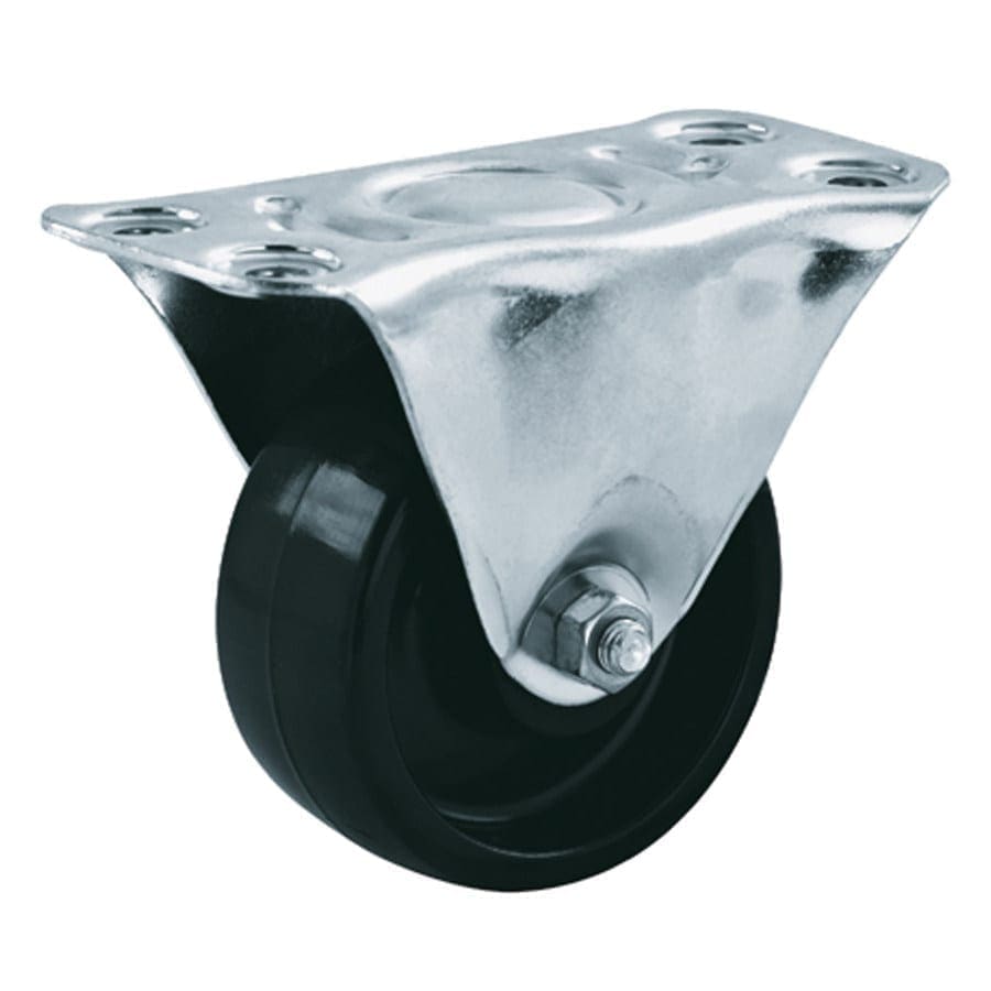 Plaatstalen vork, glansverzinkt. Zwenkkrans enkel gelagerd. Wiel serie 4E. Polypropyleen (PP) zwart. Rollager. Bedoeld voor gladde ondergrond welke niet kwetsbaar is.