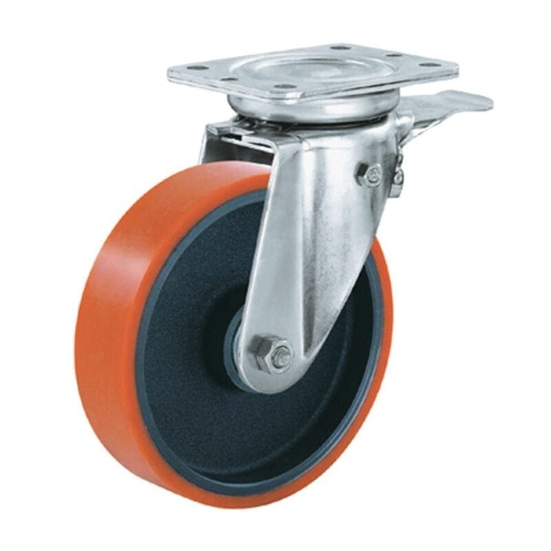 Zware plaatstalen vork, verzinkt-gepassiveerd. Speciale zwenkkrans dubbel gelagerd op drie punten aan de vork bevestigd. Wiel serie 2D. Gietijzern kern met polyurethaan (PU) band (95 graden Shore A). Kogellager. Rem blokkeert zwenk en wiel.