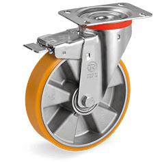 Plaatstalen vork, verzinkt. Zwenkkrans dubbel gelagerd. Wiel met aluminium kern en polyurethaan band (95 graden Shore A). Kogellager. Geeft niet af / streept niet. Bedoeld voor op een gladde ondergrond.