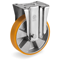 Plaatstalen vork, verzinkt. Zwenkkrans dubbel gelagerd. Wiel met aluminium kern en polyurethaan band (95 graden Shore A). Kogellager. Geeft niet af / streept niet. Bedoeld voor op een gladde ondergrond.