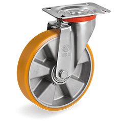 Plaatstalen vork, verzinkt. Zwenkkrans dubbel gelagerd. Wiel met aluminium kern en polyurethaan band (95 graden Shore A). Kogellager. Geeft niet af / streept niet. Bedoeld voor op een gladde ondergrond.