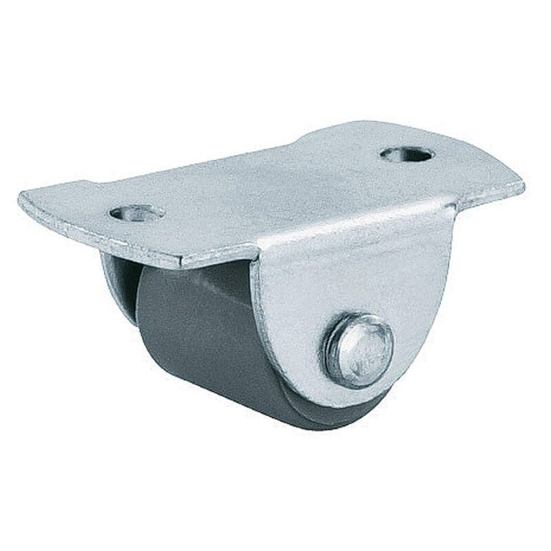 Plaatstalen vork, glans verzinkt. Polypropyleen (PP) wiel, glijlager. Van de D20B3X014GPS steekt het wiel boven de plaat uit, er is bij monteren een uitsparing voor het wiel nodig. Deze wielen worden o.a. toegepast voor (lade)geleiding.