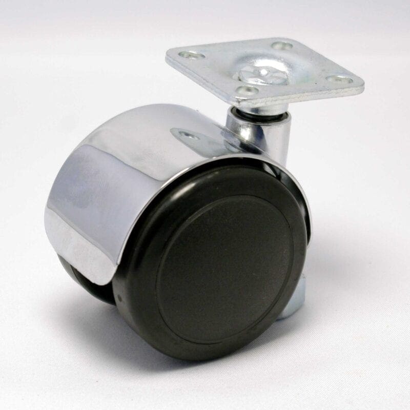 Zwenkwiel polyamide 6 (PA) kern zwart met polyurethaan (PU) zwart loopvlak. Kap aluminium zinklegering verchroomd. Glijlager. Geeft niet af / streept niet. O.a. geschikt voor houten- en parketvloeren.