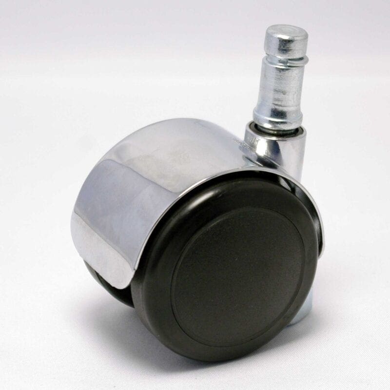 Zwenkwiel polyamide 6 (PA) kern zwart met polyurethaan (PU) zwart loopvlak. Kap aluminium zinklegering verchroomd. Glijlager. Geeft niet af / streept niet. O.a. geschikt voor houten- en parketvloeren.