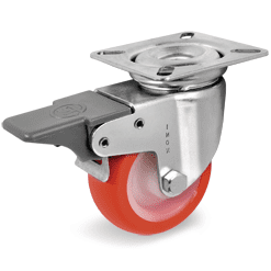 Roestvrijstalen vork AISI 304. Zwenkkrans dubbel gelagerd. Wiel met geinjecteerd polyurethaan (PU) band. Polyamide (PA) velg wit. Glijlager.