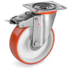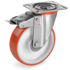 Roestvrijstalen vork. Zwenkkrans dubbel gelagerd. Wiel met geinjecteerd polyurethaan (PU) band (ca. 60 Shore D). Polyamide (PA) velg wit met kunststof draad beschermingskappen. RVS kogellager.