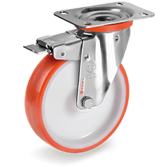 Roestvrijstalen vork. Zwenkkrans dubbel gelagerd. Wiel met geinjecteerd polyurethaan (PU) band (ca. 60 Shore D). Polyamide (PA) velg wit met kunststof draad beschermingskappen. Glijlager.