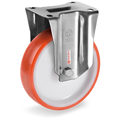 Roestvrijstalen vork. Zwenkkrans dubbel gelagerd. Wiel met geinjecteerd polyurethaan (PU) band (ca. 60 Shore D). Polyamide (PA) velg wit met kunststof draad beschermingskappen. Glijlager.
