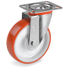 Roestvrijstalen vork. Zwenkkrans dubbel gelagerd. Wiel met geinjecteerd polyurethaan (PU) band (ca. 60 Shore D). Polyamide (PA) velg wit met kunststof draad beschermingskappen. RVS kogellager.