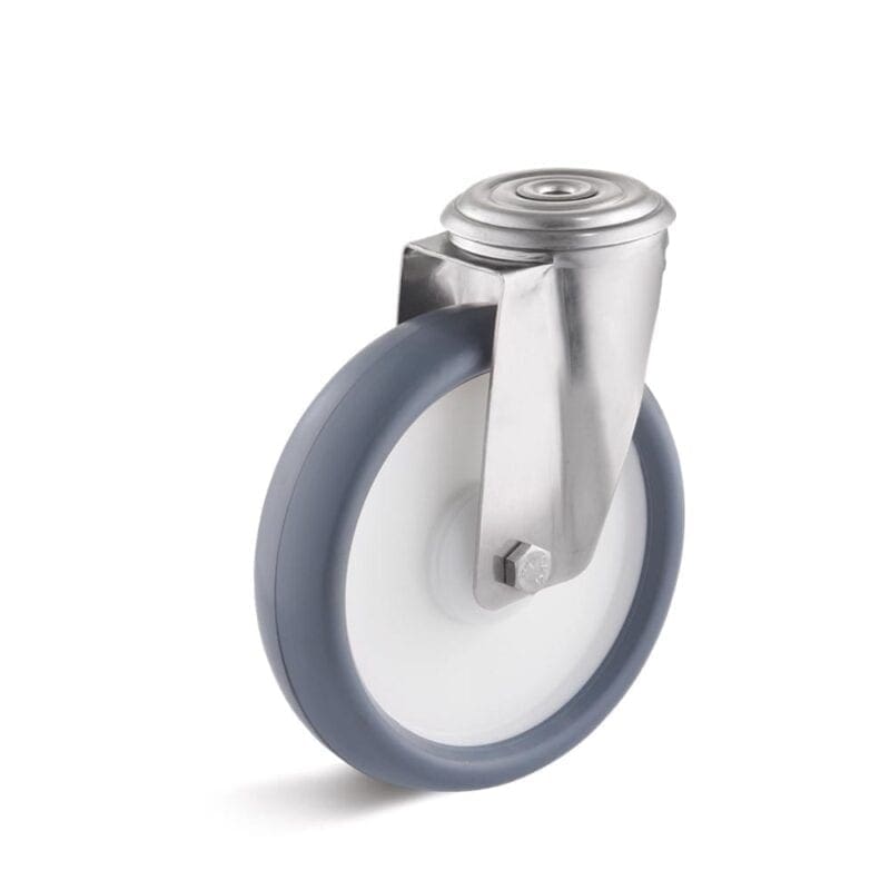 Roestvrijstalen vork. Zwenkkrans dubbel gelagerd. Wiel met thermoplastische grijs rubberband (ca. 85 graden Shore A). Kunststof velg wit met kunststof draad beschermingskappen. 1-RVS Precisiekogellager.
