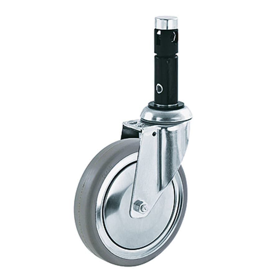 Plaatstalen vork, verzinkt-gepassiveerd. Zwenkkrans dubbel gelagerd. Stof- en spatwater afdichting in zwenkkrans d.m.v. een kunststof ring. Wiel serie 5R. Grijs rubberband (Shore A 80). Plaatstalen velg verzinkt-gepassiveerd met stalen draad beschermingskappen. Conuskogellager. Q506 3-standen. Totaal rem / vrij / richting vaststeller. Geeft niet af / streept niet.