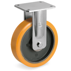 Staal gelaste vork, gegalvaniseerd. Zwenkkrans axiaal kogellager en conisch rollager in zwenk. Wiel polyurethaan (92 +/-3 graden Shore A) band met gietijzeren kern. Kogellager.