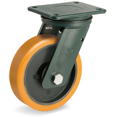 Staal gelaste vork, poedercoating donker groen. Zwenkkrans axiaal kogellager en conisch rollager in zwenk. Wiel polyurethaan (92 +/-3 graden Shore A) band met gietijzeren kern. Kogellager.
