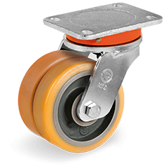 Staal gelaste vork, gegalvaniseerd. Zwenkkrans axiaal kogellager en conisch rollager in zwenk. Wiel polyurethaan (95 graden Shore A) band met gietijzeren kern. Kogellager.