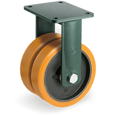 Staal gelaste vork, poedercoating donker groen. Zwenkkrans axiaal kogellager en conisch rollager in zwenk. Wiel polyurethaan (92 +/-3 graden Shore A) band met gietijzeren kern. Kogellager.